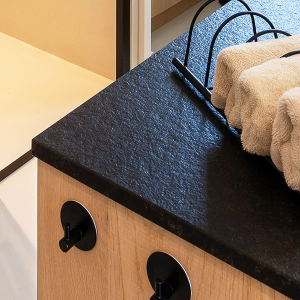 De werkbladen en vensterbank zijn uitgevoerd in graniet Zimbabwe Black Anticato, wat een luxueuze en tijdloze uitstraling biedt. Het graniet is perfect voor de natte omgevingen zoals de badkamer en biedt duurzaamheid met een strakke afwerking.