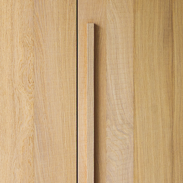 De dressing en de maatkasten zijn gemaakt van half-massief eik met een lintzaagstructuur, wat zorgt voor een robuuste, natuurlijke uitstraling.